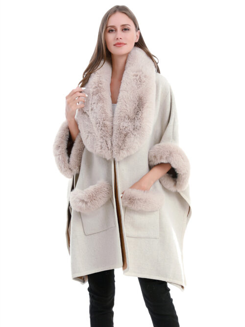 Poncho à capuchon en fausse fourrure avec des poches – Beige